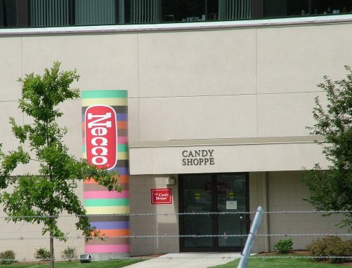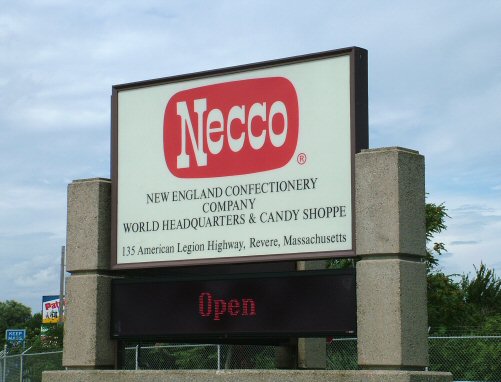Imagine our delight as we tooled out of Boston heading for Maine when we discovered, right in front of us, the NECCO factory. We had known it was somewhere in the area, but we hadn't planned to just drive right by it. We were late & tired, so Snackette dutifully marked it down in the ASF Journal, for the return trip. Unfortuntely, the Candy Shoppe is closed on Sundays, the day we swung back by and took pictures.