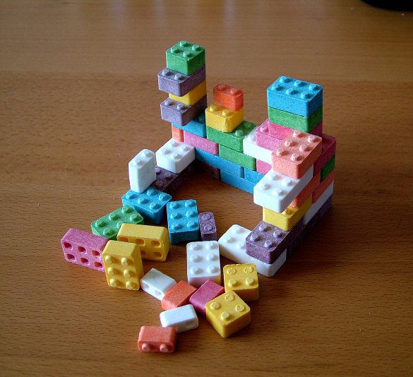 Discovered these things on the York trip. They are similar in taste and texture to Sweet Tarts and are a little bit smaller than regulation Lego blocks. Yes, they fit together very nicely.